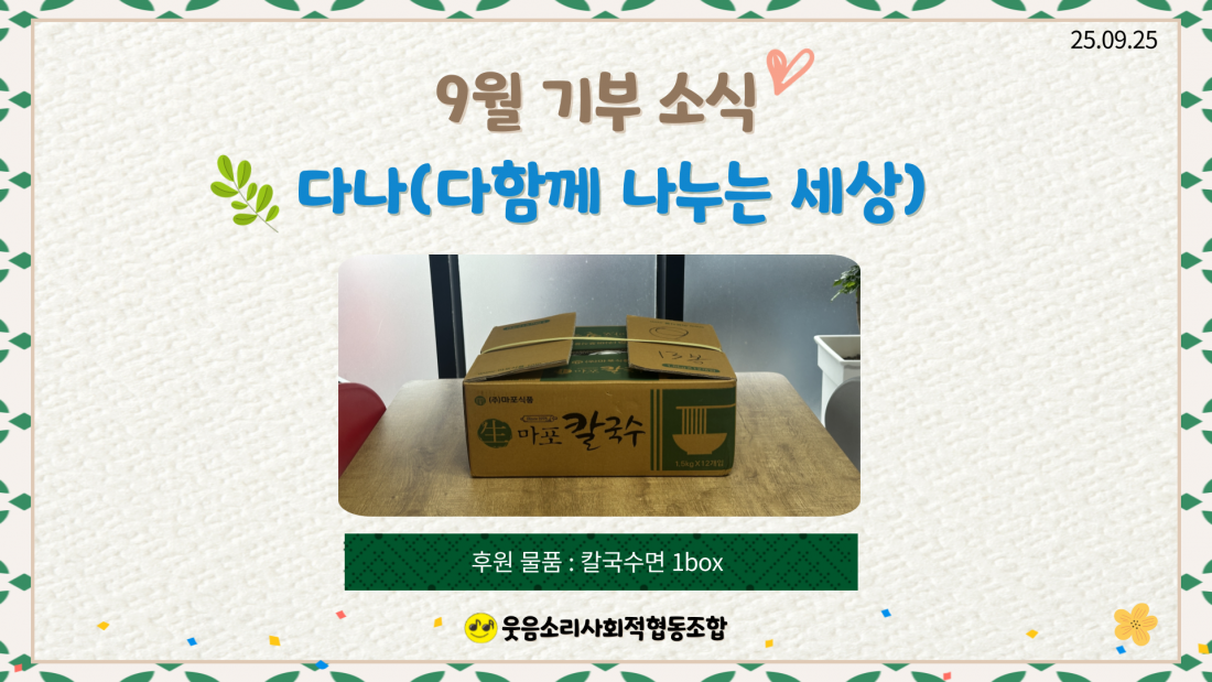9/25 다나(다함께 나누는 세상) 칼국수면 1BOX 후원 페이지 정보 작성자웃음소리사회적협동조합 댓글 0건 조회 51회 작성일 25-09-26 11:15 본문 2025.09.25다나(다함께 나누는 세상)에서칼국수면 1BOX를 웃음소리사회적협동조합에 후원해주셨습니다.따뜻한 후원 감사드립니다. 목록 댓글목록 댓글목록 등록된 댓글이 없습니다.