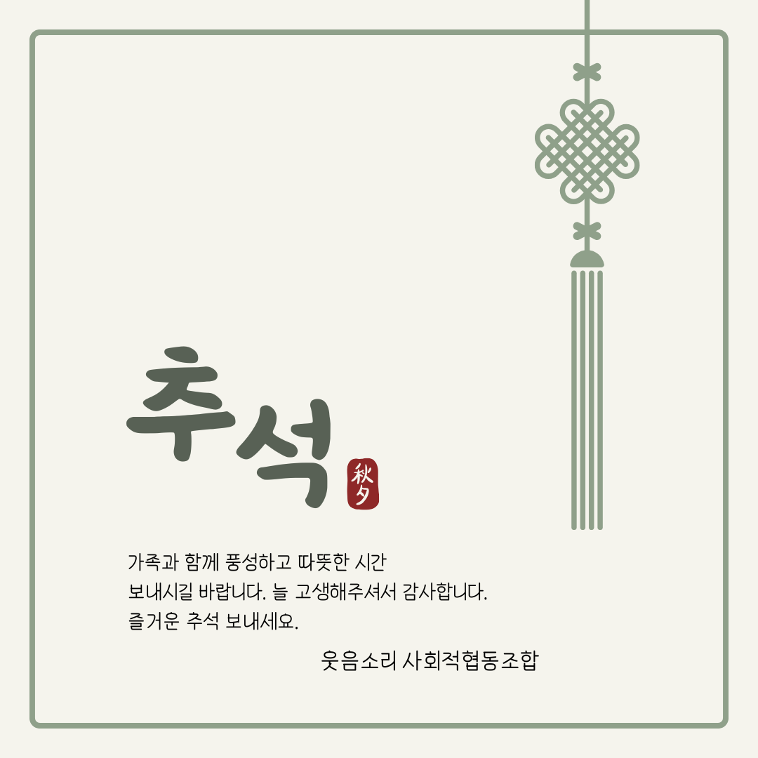 추석인사 페이지 정보 작성자웃음소리사회적협동조합 댓글 0건 조회 60회 작성일 25-10-03 13:28 본문 즐겁고 풍요로운 추석되세요 목록 댓글목록 댓글목록 등록된 댓글이 없습니다.