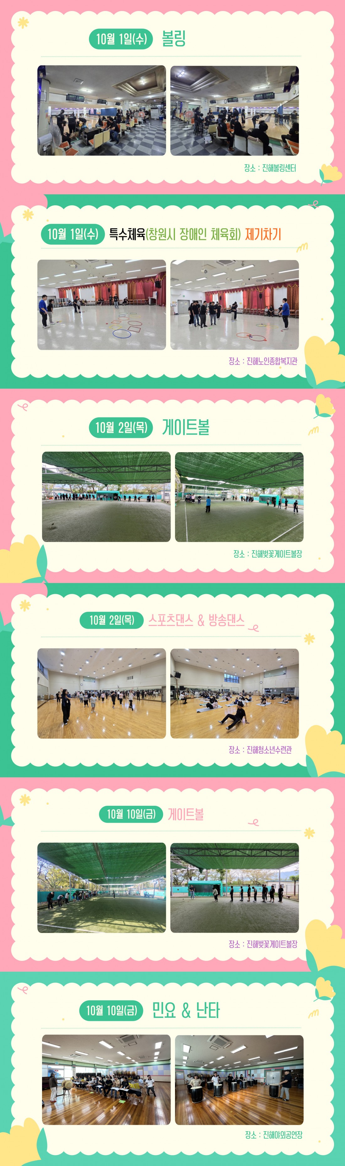 10월 1~2주차 페이지 정보 작성자웃음소리사회적협동조합 댓글 0건 조회 4회 작성일 25-10-24 09:21 본문 <10월 1주차 프로그램 일정>수(10/1)오전 : 학습활동오후 : 볼링, 특수체육목(10/2)오전 : 게이트볼오후 : 자조모임, 웰빙댄스 & 방송댄스<10월 2주차 프로그램 일정>금(10/10)오전 : 게이트볼오후 : 민요 & 난타 목록 댓글목록 댓글목록 등록된 댓글이 없습니다.