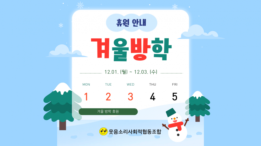 12월 휴원 안내 페이지 정보 작성자웃음소리사회적협동조합 댓글 0건 조회 6회 작성일 25-11-07 16:27 본문 웃음소리사회적협동조합에서 12월 아래와 같이 휴원합니다.휴원 기간: 2025년 12월 1일(월) ~ 12월 3일(수)이용에 참고해주시기 바랍니다.감사합니다^^ 목록 댓글목록 댓글목록 등록된 댓글이 없습니다.