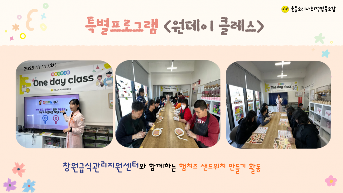 <특별프로그램 원데이클레스> 창원급식관리지원센터와 함께하는 햄치즈 샌드위치 만들기 활동 페이지 정보 작성자웃음소리사회적협동조합 댓글 0건 조회 37회 작성일 25-11-14 11:23 본문 <특별프로그램 원데이 클레스> 창원급식관리지원센터와 함께하는 햄치즈 샌드위치 만들기 활동 목록 댓글목록 댓글목록 등록된 댓글이 없습니다.