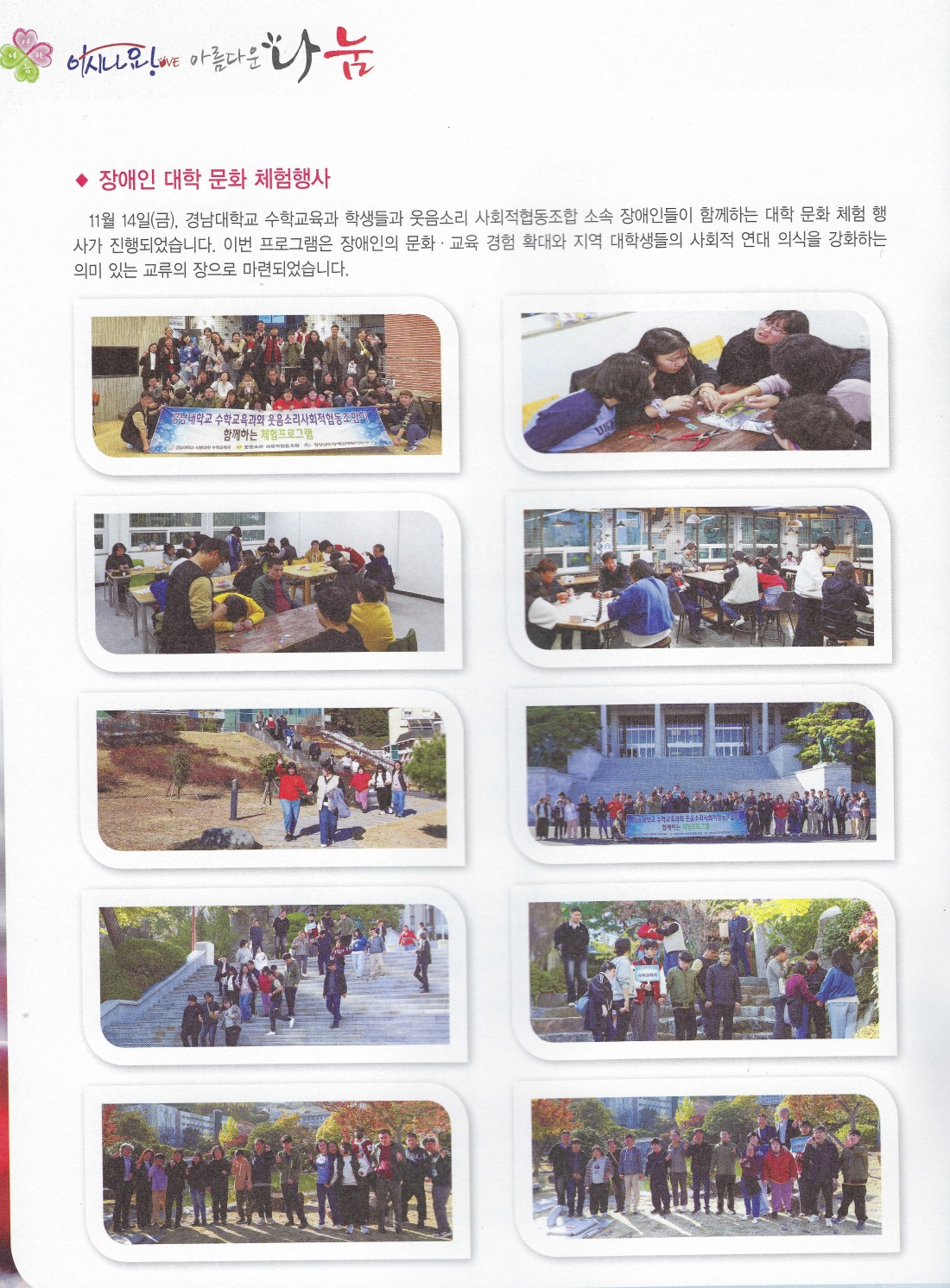 경상남도장애인재활협회 아름다운나눔지 활동소개 페이지 정보 작성자웃음소리사회적협동조합 댓글 0건 조회 7회 작성일 25-12-30 09:48 본문 매년 경남대학교 사범대학 수학교육학과와 경상남도 장애인재활협회,웃음소리사회적협동조합 3개기관 연합 행사대학체험프로그램이 아름다운 나눔지에 소개되었습니다. 목록 댓글목록 댓글목록 등록된 댓글이 없습니다.