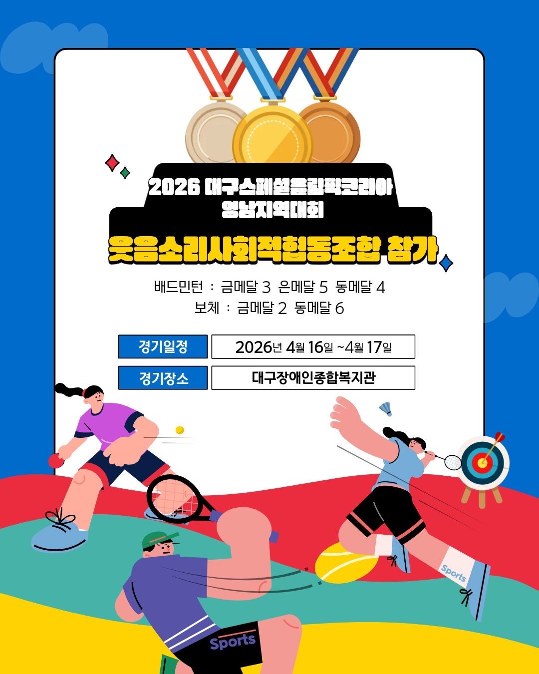제17회 대구스페셜올림픽코리아 영남대회 참가결과 페이지 정보 작성자웃음소리사회적협동조합 댓글 0건 조회 2회 작성일 26-04-19 20:59 본문 목록 댓글목록 댓글목록 등록된 댓글이 없습니다.